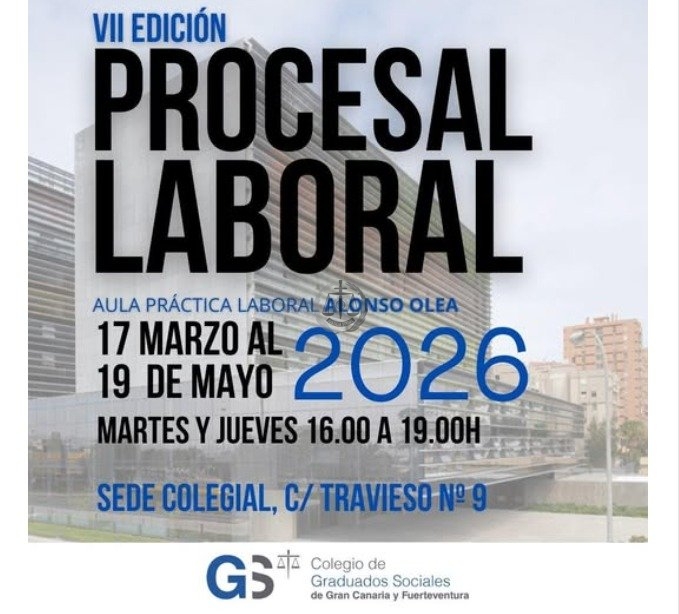 El Colegio Oficial de Graduados Sociales de Gran Canaria y Fuerteventura anuncia la celebración de la VII Edición del Curso de Práctica Procesal Laboral, una acción formativa plenamente consolidada como referente en la formación práctica en Derecho Procesal Laboral. El curso está especialmente orientado a la práctica profesional diaria, con contenidos actualizados y un enfoque eminentemente práctico, diseñado para reforzar competencias, perfeccionar la técnica procesal y aportar mayor seguridad jurídica en el ejercicio profesional. El programa cuenta con un cuadro docente de primer nivel, integrado por Magistrados y Magistradas del orden social, operadores jurídicos y profesionales con amplia experiencia, lo que garantiza una formación rigurosa, actual y directamente aplicable a la realidad de los despachos profesionales. Esta nueva edición responde al compromiso del Colegio con la formación continua de calidad, entendida como un pilar esencial para el fortalecimiento de la profesión y la mejora del servicio que se presta a empresas, personas trabajadoras y a la propia Administración de Justicia. 📌 Inscripción abierta – Plazas limitadas 👉 Consulta del programa completo: https://drive.google.com/.../1wdKW8BK.../view... 👉 Formulario de inscripción: https://docs.google.com/.../1FAIpQLSd6w6UWXjk.../viewform...