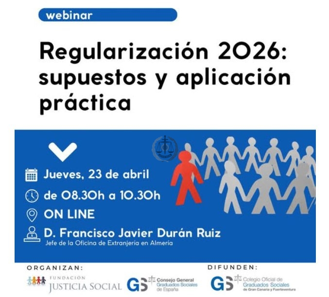📚 “Regularización 2026: Supuestos y aplicación práctica” Una sesión imprescindible para conocer, desde una perspectiva clara y práctica, los principales supuestos del proceso de regularización y su aplicación directa en el ejercicio profesional. 👨🏫 La ponencia principal estará a cargo de Francisco Javier Durán Ruíz, Jefe de la Oficina de Extranjería en Almería, quien analizará casos reales y situaciones prácticas de especial interés. 🎙️ Además, contará con la participación de: Joaquín Merchán Bermejo, presidente del Consejo General de Graduados Sociales de España María del Mar Ayala, presidenta del Colegio Oficial de Graduados Sociales de Almería Pilar Cancela Rodríguez, secretaria de Estado de Migraciones 💼 Una formación urgente, práctica y directamente aplicable al trabajo diario en materia de extranjería. 📩 El enlace de inscripción ha sido remitido al correo electrónico de la colegiación. ⏳ No te quedes fuera.