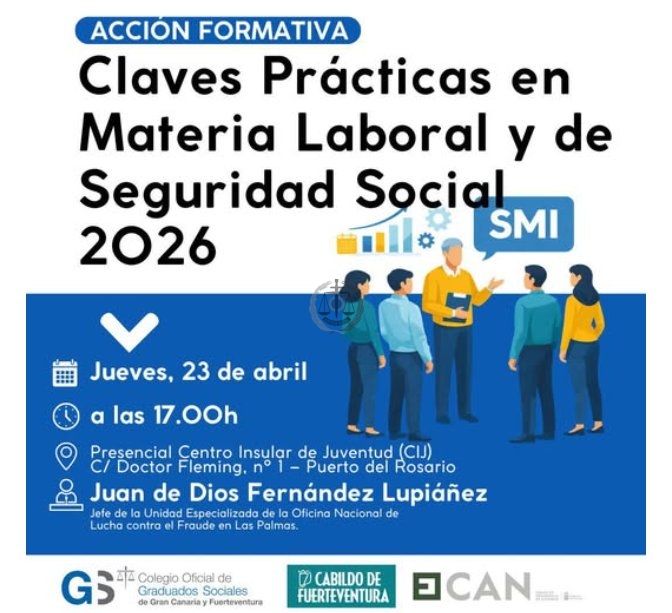 📚 Claves Prácticas en Materia Laboral y de Seguridad Social 2026 📅 Hoy, jueves 23 de abril 🕔 17:00 horas 📍 Centro Insular de Juventud (CIJ), Puerto del Rosario La sesión contará con la intervención de Juan de Dios Fernández Lupiáñez, Jefe de la Unidad Especializada de la Oficina Nacional de Lucha contra el Fraude en Las Palmas, quien abordará las principales novedades normativas y criterios de aplicación práctica en materia laboral y de Seguridad Social. Se tratará de una formación útil, actual y orientada a ofrecer herramientas directamente aplicables al ejercicio profesional diario, especialmente en despachos, asesorías y departamentos de Recursos Humanos. ⏳ Aún está a tiempo de asistir 📩 Consulte su correo electrónico para acceder al enlace de inscripción y toda la información de acceso.
