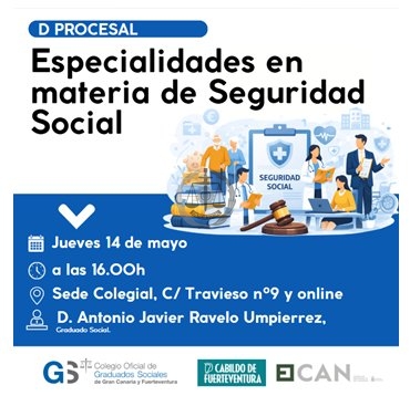Fecha: Jueves, 14 de mayo de 2026 Hora: 16:00 h Modalidad: Presencial y online Lugar: Sede colegial · C/ Travieso nº 9 · Las Palmas de Gran Canaria El Colegio Oficial de Graduados Sociales de Gran Canaria y Fuerteventura celebra una nueva sesión dentro de su programación especializada en Derecho Procesal Laboral bajo el título: 📚 “Especialidades en materia de Seguridad Social” La jornada será impartida por Antonio Javier Ravelo Umpiérrez, Graduado Social colegiado, quien ofrecerá una visión técnica y práctica sobre las particularidades procesales y sustantivas que presenta la materia de Seguridad Social en el ejercicio profesional diario. Durante la sesión se abordarán cuestiones clave relacionadas con prestaciones, procedimientos específicos, criterios de actuación y aspectos de especial relevancia en la defensa de derechos vinculados al sistema de Seguridad Social. Esta formación permitirá a los profesionales reforzar conocimientos especializados y mejorar la intervención técnica en una materia de gran trascendencia para empresas, personas trabajadoras y ciudadanía. 🎯 Una jornada orientada a la actualización normativa, la seguridad jurídica y el fortalecimiento del ejercicio profesional. 📩 Consulte su correo electrónico para acceder al enlace de inscripción y toda la información de acceso.