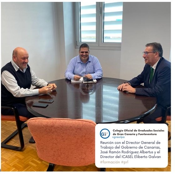 Nueva reunión de trabajo celebrada con el director general de Trabajo del Gobierno de Canarias, José Ramón Rodríguez Albertus y el director del Instituto Canario de Seguridad Laboral, Eliberto Galván. Durante la reunión se abordaron varios asuntos que afectan al colectivo que representa el Colegio, así como las posibles vías de colaboración entre ambas entidades.