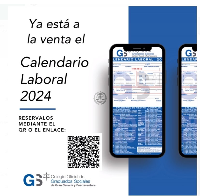 Ya se encuentran disponibles y a la venta los Calendarios Laborales 2024. Puedes reservarlos en este enlace: https://sge.st/NdkIgde Una vez cursada la reserva se le enviará un correo en el que se indicará la fecha de retirada de los mismos en ambas sedes del Colegio. No lo dejes para el final y colabora con el Colegio.