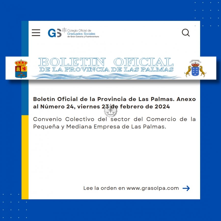 Facilitamos el enlace al Convenio Colectivo del sector del Comercio de la Pequeña y Mediana Empresa de Las Palmas, publicado en el BOP del 23 de febrero de 2024. ENLACE: https://sge.st/6W9eJXw
