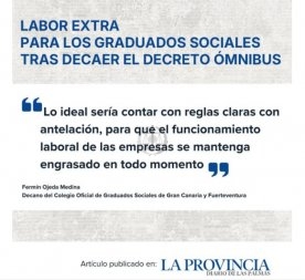 Esta situación ha sido recogida por el diario La Provincia, que publica las declaraciones de Fermín Ojeda Medina, decano del Colegio Oficial de Graduados Sociales de Gran Canaria y Fuerteventura, quien advierte del impacto real y operativo que esta falta de previsión normativa está teniendo sobre un colectivo que gestiona la actividad laboral de ocho de cada diez empresas canarias.