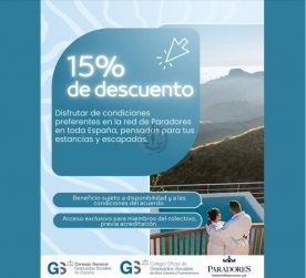 Por su condición de Graduado Social colegiado, puede disfrutar de condiciones preferentes en la red de Paradores de Turismo de España, en todo el territorio nacional, gracias a un acuerdo exclusivo suscrito en beneficio de nuestro colectivo profesional.